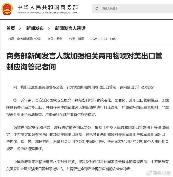 为什么针对美国加强两用物项出口管制?商务部答问