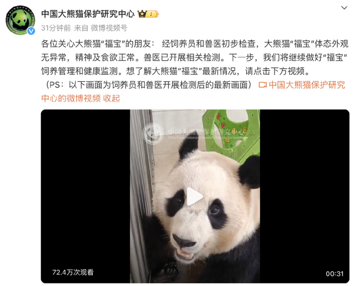 12月3日上午,熊猫中心神树坪基地发现大熊猫“福宝”出现状况异常。3日晚,中国大熊猫保护研究中心发布大熊猫“福宝”最新情况。经饲养员和兽医初步检查,大熊猫“福宝”体态外观无异常,精神及食欲正常。兽医已开展相关检测。