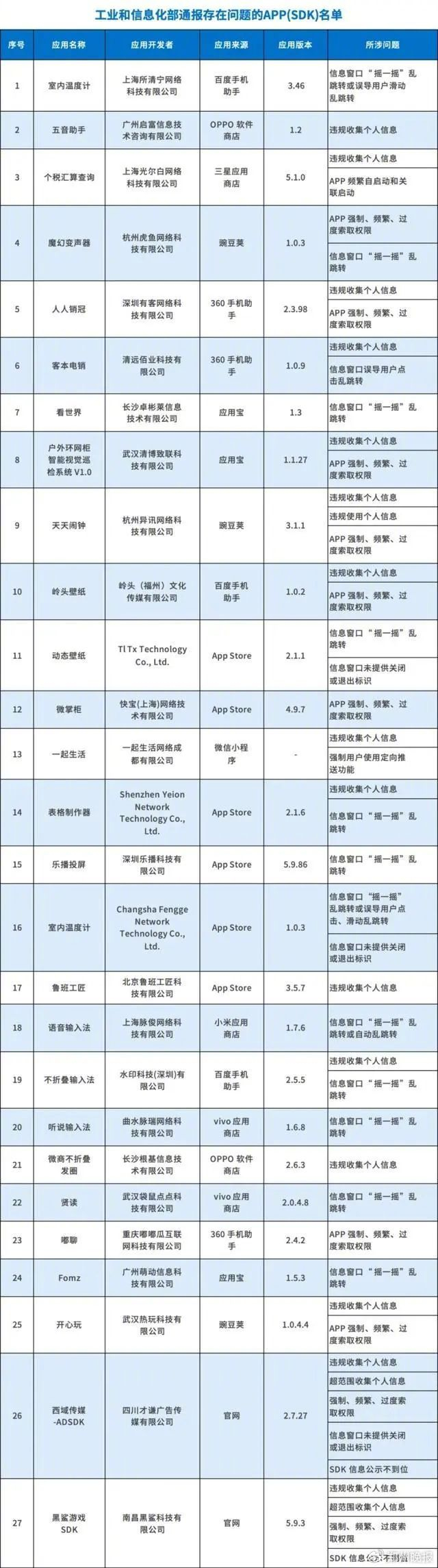工信部通报27款APP存在侵害用户权益行为