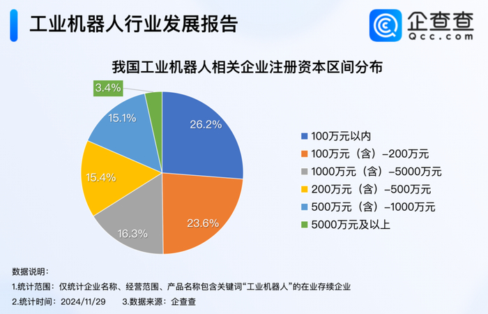 企查查数据显示,公示注册资本的工业机器人现存企业中,注册资本在100万元以内的企业最多,占比26.2%,其次是注册资本在100万元至200万元之间的企业,占比23.6%,综合来看,我国工业机器人相关企业注册资本以200万元以内为主,合计占比49.8%。此外,注册资本在1000万元至5000万元之间的企业,占比16.3%。