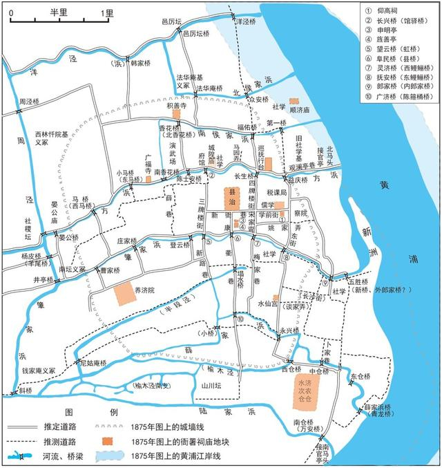 早在筑城之前的明嘉靖初年,上海县市之中已出现对应于晚清时期的四纵四横栅格状干线路网;结合嘉靖志记载的38座桥梁分布,即可较为准确地勾勒出明中叶上海县市的大致范围——北起洋泾浜,南至薛家浜,西起周泾,东至黄浦江滨。对比复原图,可知当时城市规模与近代相差不大。