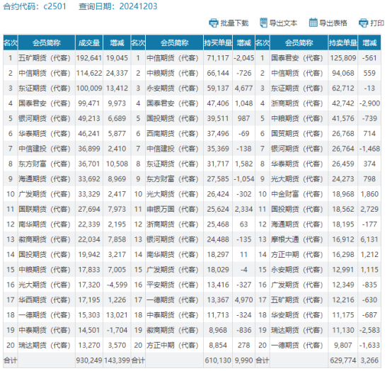 从持仓报告看,C2501的总成交量为93万余手,较昨日增加14万余手,不过较上周同期增加26.6万手。今日多头主力增加9990手,空头主力增加3266手。玉米主力盘面增仓下行,资金持续流出,同时成交量大幅增加,说明市场博弈较为激烈,面临转折点。