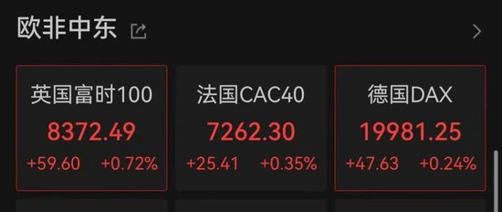 其他市场方面,欧洲股市多数上涨,其中,英国富时100指数涨超0.66%,法、德两国重要股指也纷纷拉涨。