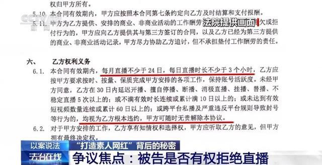 晓棠针对合同中的一些条款提出了质疑。比如,合同规定,博主每月直播不少于24天,每天直播的时长不少于3个小时。晓棠因为住在宿舍,没有直播的环境。对此公司承诺晓棠,不需要直播;再比如,合同规定博主每个月更新短视频的数量不得低于30条,对此公司解释说,可以按照晓棠合适的时间来,这份合同只是个模板,没有实质性的作用。