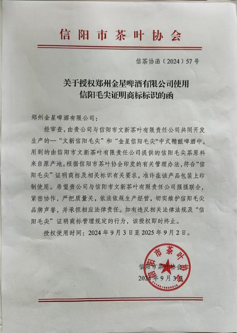 那么,金星啤酒、文新茶叶生产销售“信阳毛尖”中式精酿啤酒,是否取得了信阳市茶叶协会授权?