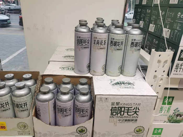 顶端新闻走访信阳市区喜来客折扣超市、西亚超市贸易广场店、百川酒行、天下粮仓折扣超市、百家顺生活超市、美宜佳超市等商超,发现均有“信阳毛尖”中式精酿啤酒在售,以文新、金星品牌居多,还有少量疯狂老虎、广义、潮力版、升级版等品牌。