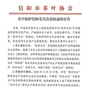 根据信阳市茶叶协会的公告,任何“茶啤酒”等非信阳毛尖茶品类产品生产销售宣传中商标性使用“信阳毛尖”字样行为,均属于侵犯“信阳毛尖”商标权。