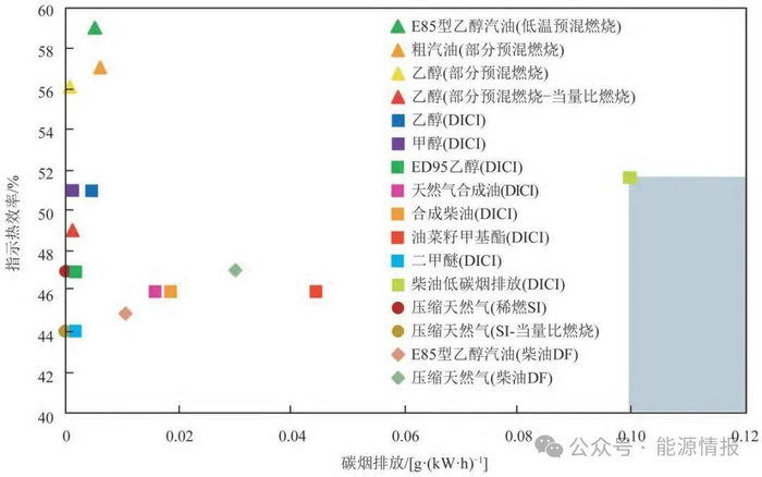 瑞典等部分欧洲国家对船用甲醇发动机的研究和应用已较为成熟。图1为瑞典隆德大学对重载发动机替代燃料燃烧模式与指示热效率、碳烟排放量关系的理论研究成果。