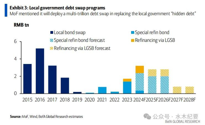具体来说,在财政政策方面,我们预计2025年将采取以下财政措施,这可能导致政府债务额外扩张,相当于GDP的1.1%左右:1)财政赤字从2024年的3.0%扩大到3.5%,加大中央对地方的财政转移支付力度;2)继续发行超过1.5万亿元人民币的特别国债(今年为10亿元人民币),支持投资和消费(尤其是消费者以旧换新政策和对特定群体的支持,另见:财政观点);3)从2024年底开始,按顺序发行1000亿元人民币的特别国债,用于大型商业银行的资本注入;4)2025年启动多年期债务置换计划(图表3);5)更高的地方政府债券发行额(4.5万亿元人民币)用于债务置换(8000亿元人民币)、土地和未售出房屋库存购买以及传统的基础设施相关项目。