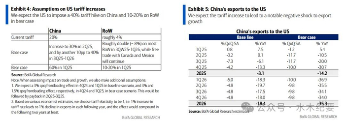 在悲观情况下,即 2025 年第一季度所有中国商品即将征收 60% 的关税,没有谈判余地,世界其他地区也将被征收关税,中国明年可能难以保持 4% 以上的增长率。