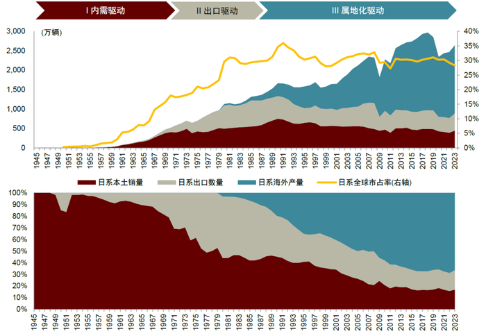 根据不同时期产销特点,我们把日系车企的发展历程概括为“内需驱动”、“出口驱动”、“属地化驱动”三个阶段。