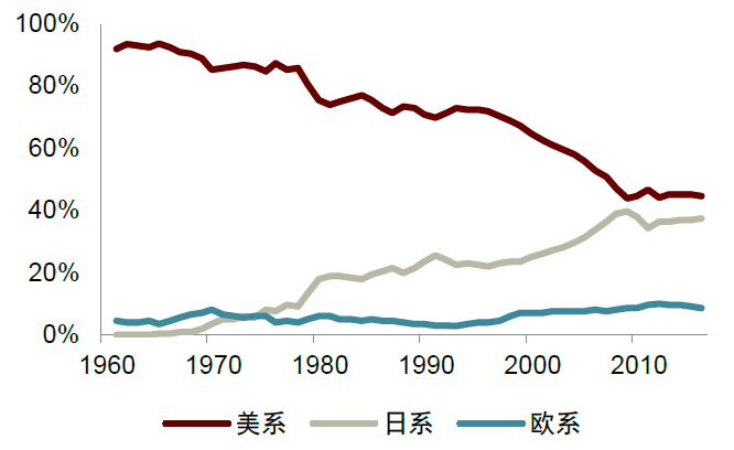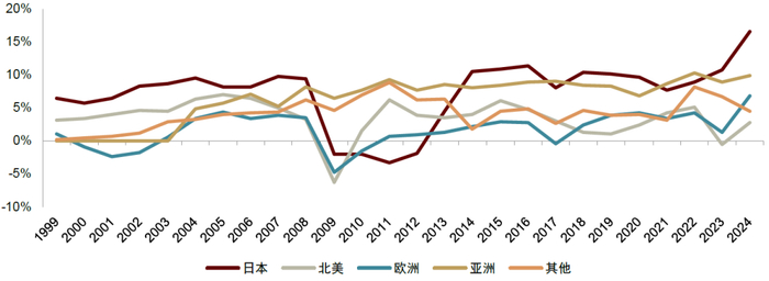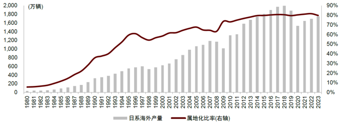 接力出口,海外产量成为日系车企增长点。1980年以来,日系车企海外产量呈现增长态势;尤其20世纪90年代,日本经济泡沫破裂,本土汽车产量和出口转弱,海外产量成为日系车企新的增长点,最高接近2000万辆,1994年海外属地化比率首次突破50%,近年保持在80%左右。结构上,亚洲和北美是日系车企的海外生产重心。