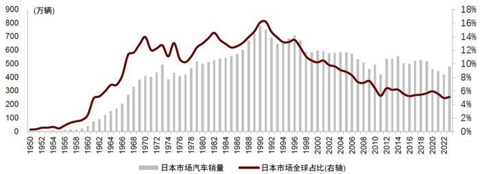图表2:20世纪60年代日本汽车市场成长壮大,全球份额突破10%