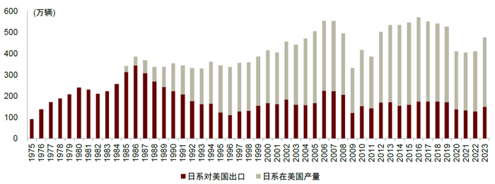 回顾日系车企开拓美国市场的历程,初期以产品出口为主,最高突破300万辆;20世纪80年代中期以后,汽车出口转弱,属地化生产逐步成为主流,带动日系在美销量突破500万辆。我们总结日系车企通过三次“转危为机”,成功立足美国市场,市场份额实现突破。