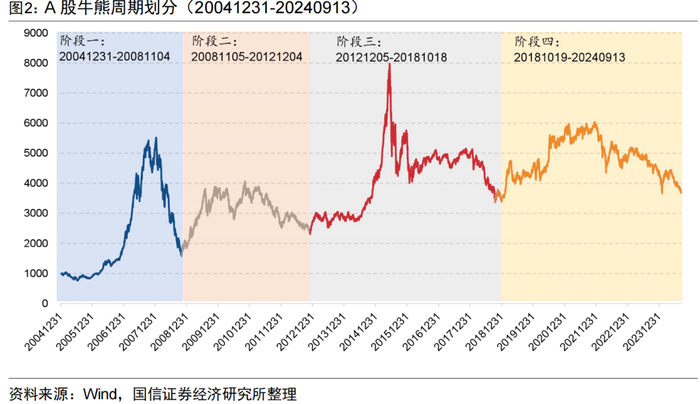 稳健型与进攻型策略在不同的市场环境下表现互有胜负,在市场整体上行的牛市中进攻型策略弹性大,在市场下行的熊市中稳健型策略防御性强,因而我们拉长周期,考察一个完整的牛熊周期下稳健型与进攻型策略的表现。我们以中证全指指数代表A股市场的总体走势。图2展示了A股的牛熊周期划分,2005年以来,A股经历了4轮牛熊周期,每轮周期持续时间约为4-5年。