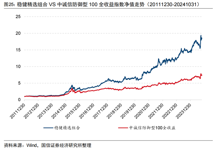图25展示了稳健精选组合与中诚信防御型100全收益指数的净值走势,稳健精选组合2012年以来大幅跑赢中诚信防御型100全收益指数。