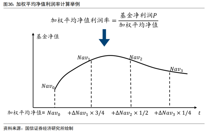 其中 P 为基金报告期净利润,n 为报告期内所含交易天数,i 为报告期内的第 i 个交易日,Nav_0 为期初资产净值,ΔNav 为前后交易日基金净值变动。对于加权平均净值利润率的分母,可将其拆解为: