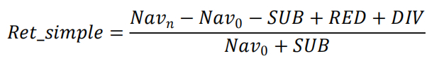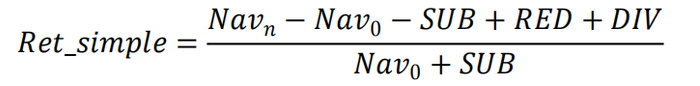 其中 Nav_n 为期末资产净值,Nav_0 为期初资产净值,SUB为区间总申购金额,RED 为区间总赎回金额,DIV 为分红总额。