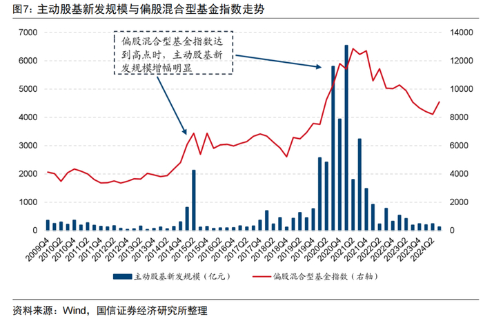 图7展示了主动股基的新发规模与偏股混合型基金指数的走势,可以看到,当偏股混合型基金指数达到阶段高位时,如2015年和2021年,较多的投资者被吸引入场,导致新发主动股基规模的也处在历史高位。而当偏股混合型基金指数下行时,主动股基新发规模下降较快,两者存在同步的现象。这表明基民的申赎行为具有一定的趋势性,市场向好时加大申购,市场遇冷时则集中赎回。