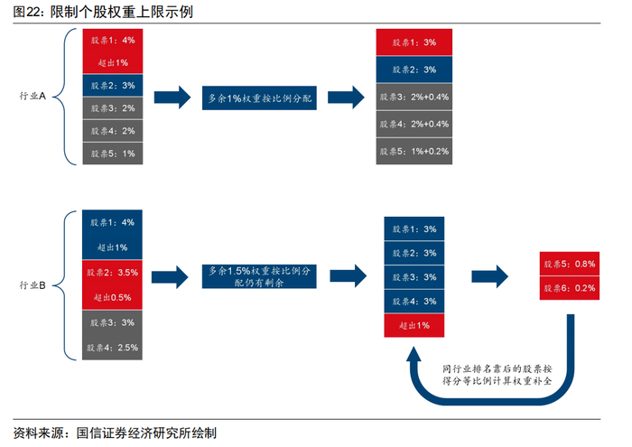 图22展示了限制个股权重上限的流程示例,在行业A中,仅有股票1超出3%的权重上限,我们将多余1%的权重分配至权重不足3%的股票3、4、5上,根据股票3、4、5各自的权重比例,多出权重的分配比例为2:2:1,即最终三只股票新分得的权重为0.4%、0.4%、0.2%,新分配权重后没有个股超出3%的上限。