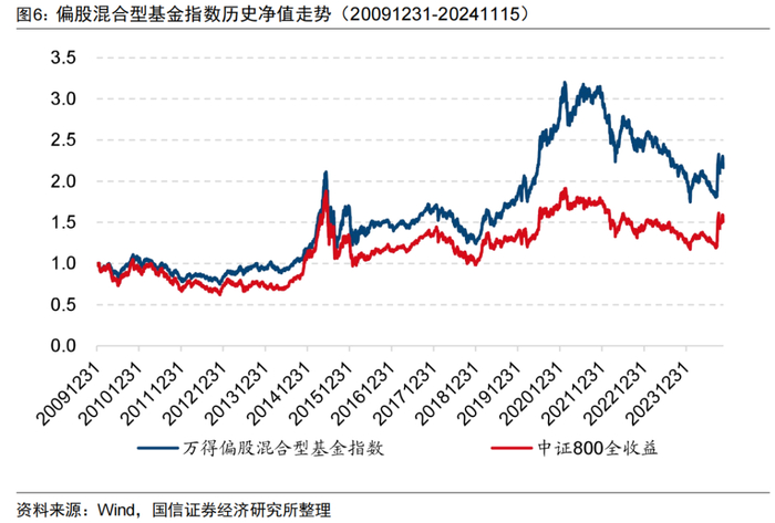 在基金规模增长的同时我们也要关注基金近年来的业绩表现,以偏股混合型基金指数(885001.WI)作为主动股基的代表,图6展示了偏股混合型基金指数与中证800全收益指数的走势,该指数2010年以来年化收益为5.58%,相对同期中证800全收益指数年化超额2.64%。可见机构投资者凭借深厚的研究积累与专业的投研能力,长期来看能够战胜宽基指数。