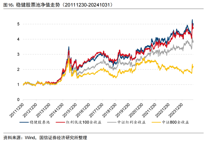 基于图14中的低估值、低波动、低换手、高股息4个维度的稳健因子,我们由此构建稳健股票池,具体构建方式如下: