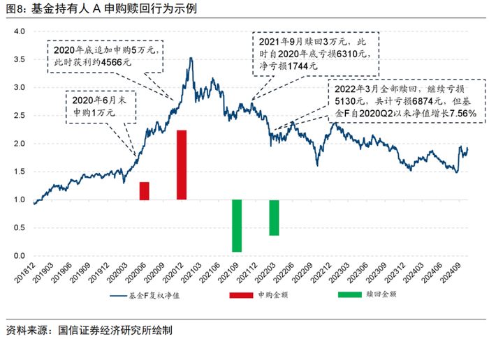 在这种情况下基金F净值增长但持有人A反而亏损,出现“基金赚钱基民不赚钱”的现象。