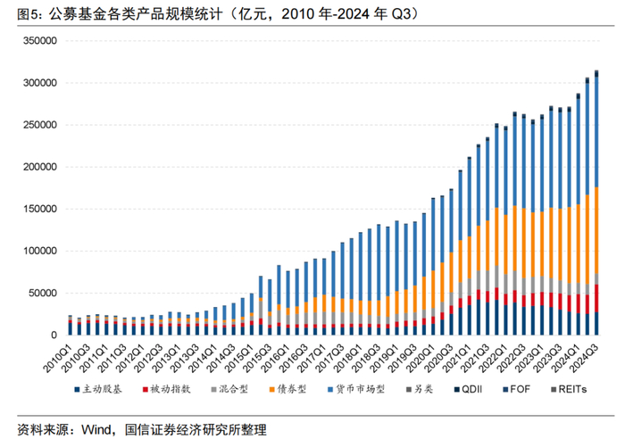 随着我国经济的快速发展,居民财富的大量积累带动了资产管理的旺盛需求。与第一章内容保持一致,我们将普通股票型与偏股混合型基金定义为主动股基,被动指数型与增强指数型基金定义为被动指数基金,主动股基与被动指数基金合称权益型基金。图5展示了2010年以来各类公募基金规模变化情况。截至2024年9月30日,我国公募基金总规模达31.52万亿元,总体呈逐年增长的态势。其中权益型基金规模持续增长,主动股基规模2.76万亿,被动指数基金规模3.30万亿。