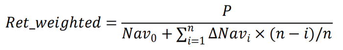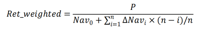 其中 P 为基金报告期净利润,n 为报告期内所含交易天数,i 为报告期内的第 i 个交易日,Nav_0 为期初资产净值,ΔNav_i 为前后交易日基金净值变动。