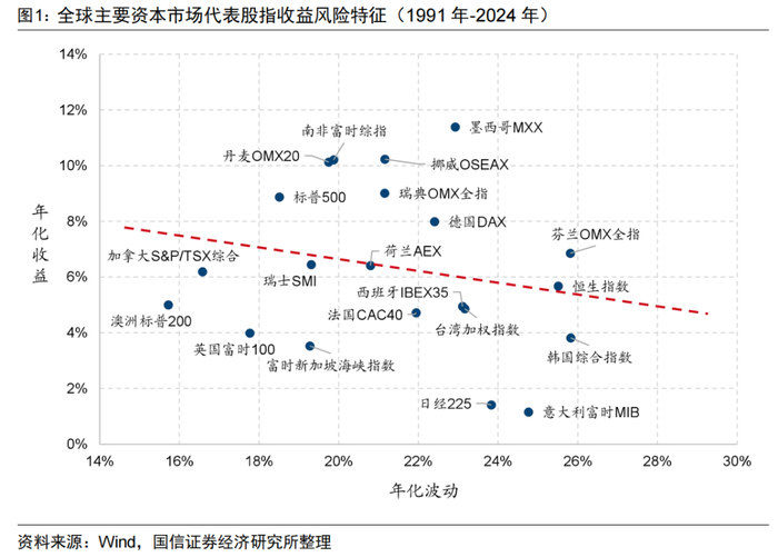 我们统计了1991年以来全球主要资本市场代表指数的收益风险特征,横轴代表年化波动,纵轴代表年化收益。可以看出过去30多年来,全球股票市场收益与波动的回归拟合曲线略向下倾斜,这与“高收益高风险”的理论相悖。最具代表性的美国标普500指数,过去30余年以来年化收益近9%,其19%的年化波动也处在各市场股票指数中较低的位置。各个市场代表性股票指数年化收益与年化波动之间向下倾斜的拟合曲线表明,高收益未必伴随着高波动。