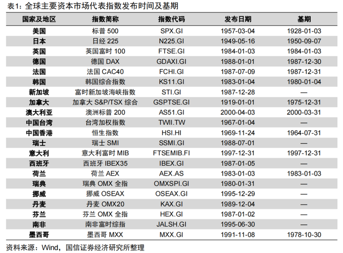 表1列示了全球主要资本市场代表性股票指数以及其发布日期。美国和日本的代表指数发布时间较早,在上世纪50年代便已发布,其余主要资本市场代表指数均在上世纪80年代左右发布。我国于1990年12月19日成立上海证券交易所,A股从此诞生。2005年沪深300与中证500等代表指数相继发布,与全球主要资本市场相比A股成立年限较短,属于新兴市场。