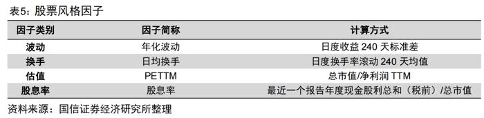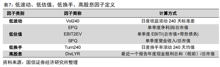 除了波动率这一个指标,我们借鉴上文对于主动股基的研究思路,考察低波动、低估值、低换手、高股息等相关因子在A股中的选股表现。具体的指标及其计算方法见表7。