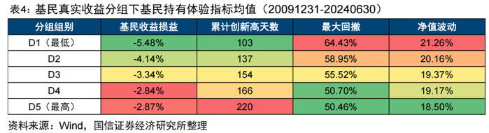 在2010Q1至2024Q2区间中,我们将主动股基的基民真实收益按大小分为5组,计算每组基民持有体验指标的均值。表4展示了按基民真实收益分组下最高的组(D1)到最低的组(D5)中基民持有体验指标的均值情况。
