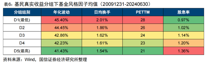 表6中展示了2010Q1至2024Q2这段时期中,按基民真实收益指标分为5组,各组别基金持仓的波动、换手、估值、股息率等风格因子的均值表现,其中D1代表基民真实收益最低的一组,D5为基民真实收益最高的组。