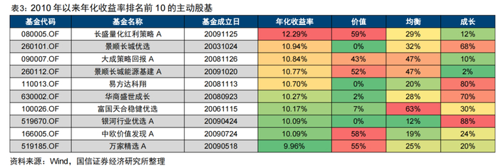 进一步统计2010年以来所有普通股票型基金和偏股混合型基金的年化收益率情况,我们将这两类权益型基金定义为主动股基。表3列出了20091231-20241115期间年化收益率排名前十的主动股基。我们同时考察了基金在不同报告期被划分至价值风格、均衡风格和成长风格的期数占比。例如,若某基金成立以来共披露50个报告期,其中20个报告期被划分为价值风格,则价值风格期数占比为40%。
