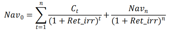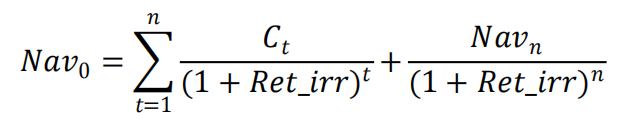 基民内部收益率(Ret_irr):该指标的思想是将基金作为一个投资项目,在一段区间内,基民首先投入与基金资产净值等额的现金流;基民在区间中的赎回(申购)作为项目中途获得的收益(继续投入的金额),此外基金在区间里的分红也需纳入考虑;在期末基民获得与基金期末资产净值相同的现金流。基民内部收益率(Ret_irr)即为基民总体流入金额与流出金额相等时的内部折现率。即:
