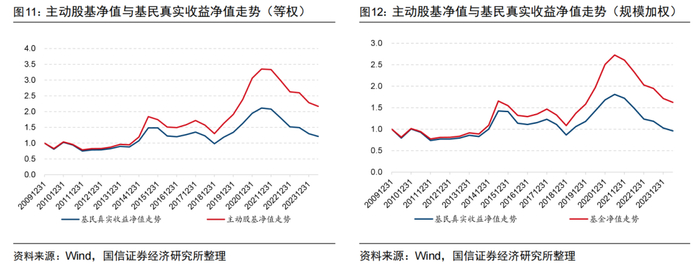 图11与图12对比了等权与规模加权下主动股基净值与基民真实收益的净值走势,主动股基的净值收益表现往往高于基民真实收益。采用等权方式构建两者净值走势时,主动股基2010年以来净值增长116.79%,而基民真实收益净值仅增长21.37%;按基金规模加权方式构建时,主动股基2010年以来净值增长62.36%,而基民真实收益净值则没有增长,反而下跌4.09%。