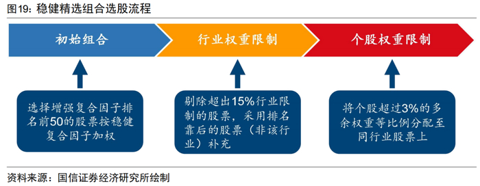 我们在稳健股票池中采用上述增强复合因子对股票池进行进一步的精选。同时为了避免行业与个股权重过于集中,我们在构建组合时对行业与个股权重上限进行限制,具体的构建要素如下: