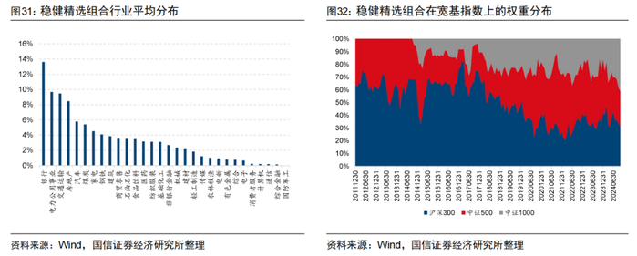 由于稳健精选组合在中证800与中证1000成分股的并集中选样,我们在图32中展示了稳健精选组合在沪深300、中证500和中证1000成分股上的权重分布。总体来看组合平均有50%的权重属于沪深300成分股,在中证500成分股上平均权重分布为33%,在中证1000上平均权重分布为17%。