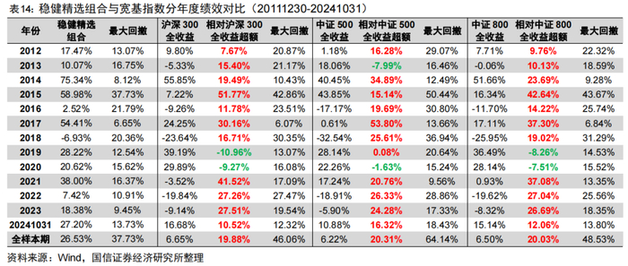 我们也将稳健精选组合与沪深300全收益、中证500全收益以及中证800全收益等更具代表性的宽基指数的分年度绩效进行对比,表14中可以看到稳健精选组合仅在2019-2020年没有跑赢宽基指数,在其余年份基本都能战胜宽基指数,年化超额约为20%。整体来看,稳健精选组合最大回撤显著低于主流宽基指数。