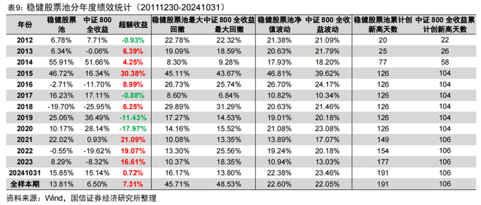 表9展示了稳健股票池与中证800全收益指数的分年度绩效表现,稳健股票池自2012年以来录得13.81%的年化收益,而中证800全收益指数的年化收益6.50%,年化超额7.31%。最大回撤与净值波动在大多数年份低于中证800全收益指数。股票池组合创新高能力较强,累计创新高天数远超中证800全收益指数。