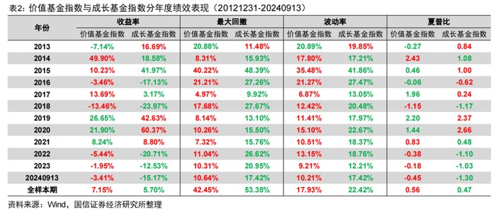 表2为2013年以来两轮牛熊周期下价值基金与成长基金的分年度收益表现。总体来看价值基金指数表现好于成长基金指数,年化收益率达7.15%,高于同期成长基金指数5.70%的年化收益,整体夏普比更高,波动率与最大回撤更低。