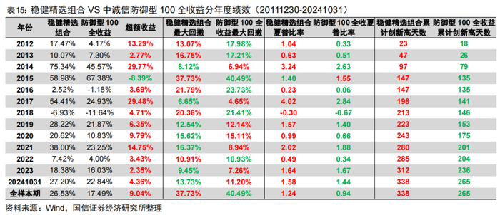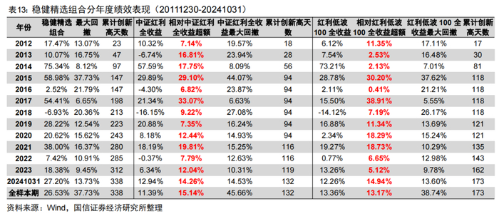 组合构建与绩效:稳健精选组合月末调仓,选择增强复合因子排名靠前的股票,采用稳健复合因子加权,限制行业权重上限15%、个股权重上限3%。稳健精选组合2012年以来年化收益26.53%,每年都能战胜中证红利全收益指数与红利低波100全收益指数,年化超额分别为15.14%、13.17%;组合创新高能力强,2012年以来累计创新高天数338天,创新高率10.85%。此外,稳健精选组合基本每年都能战胜中诚信防御100全收益指数,2012年以来年化超额达9.04%。