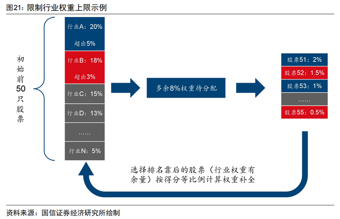 图21展示了限制行业权重上限的过程,选择按增强复合因子前50的股票构建最初组合后,发现行业A与行业B超过了15%的权重上限,我们将两行业超过上限排名靠后的股票剔除(如行业A排名前7的股票累计权重为14.5%,前8累计权重15.5%,则保留前8只股票),并将该行业权重归一化至15%。剔除后剩余8%的权重待分配,我们找出增强复合因子排名50名后(所属行业未超上限)的股票填充,权重采用股票的理论权重。