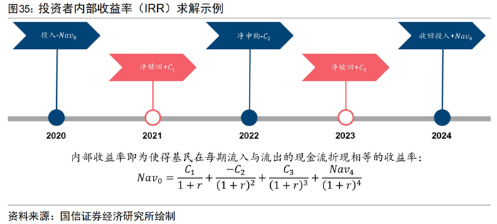 基民内部收益率(Ret_irr):基民总体流入金额(净申购)与流出金额(净赎回与现金分红)相等时的内部折现率。即: