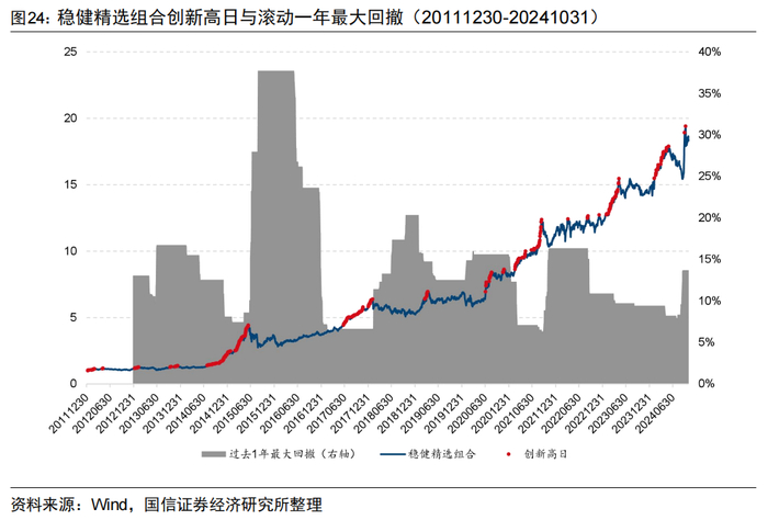 图24展示了稳健精选组合创新高日的分布与其滚动一年最大回撤的情况,组合创新高能力强,创新高日分布较为平均,基本每年都能创新高。组合2012年以来累计创新高天数为338天,在2012年以来的3115个交易日中,创新高率为10.85%。