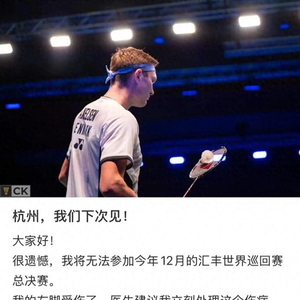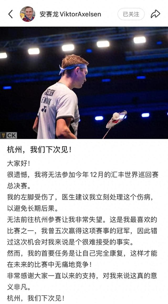 2024年巴黎奥运会上获得金牌后,安赛龙自动获得了世界羽联杭州年终总决赛资格。在社交媒体上他原本和球迷约好“杭州见”,没想到因为伤病影响最终不得不选择退出。