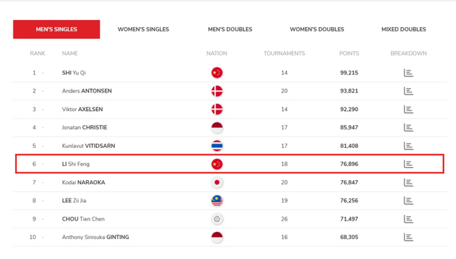 目前总决赛积分男单排名中李诗沣位居第八,上个月他刚刚赢得了2024年日本羽毛球熊本大师赛,排名飙升。