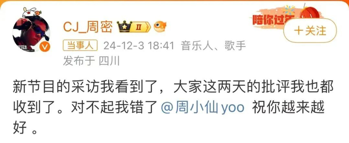 12月3日晚,说唱歌手周密发文向前女友周芯竹致歉。“对不起我错了,祝你越来越好 。 ”#周密向周芯竹道歉#登上微博热搜第一!