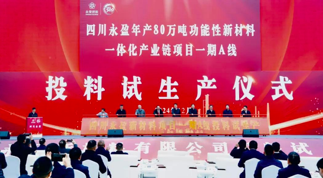 在四川省委省政府、南充市委市政府、金融机构、行业协会、客户代表等100多位领导嘉宾的共同见证下,永荣控股集团投资的四川永盈年产80万吨功能性新材料一体化产业链项目一期A线投料试生产仪式成功举行。仪式上,项目生产装置区引入天然气,乙炔裂解装置安全火炬点火成功,试生产各项工作将有序开展,标志着项目一期工程A线建设竣工,正式进入投料试生产阶段。